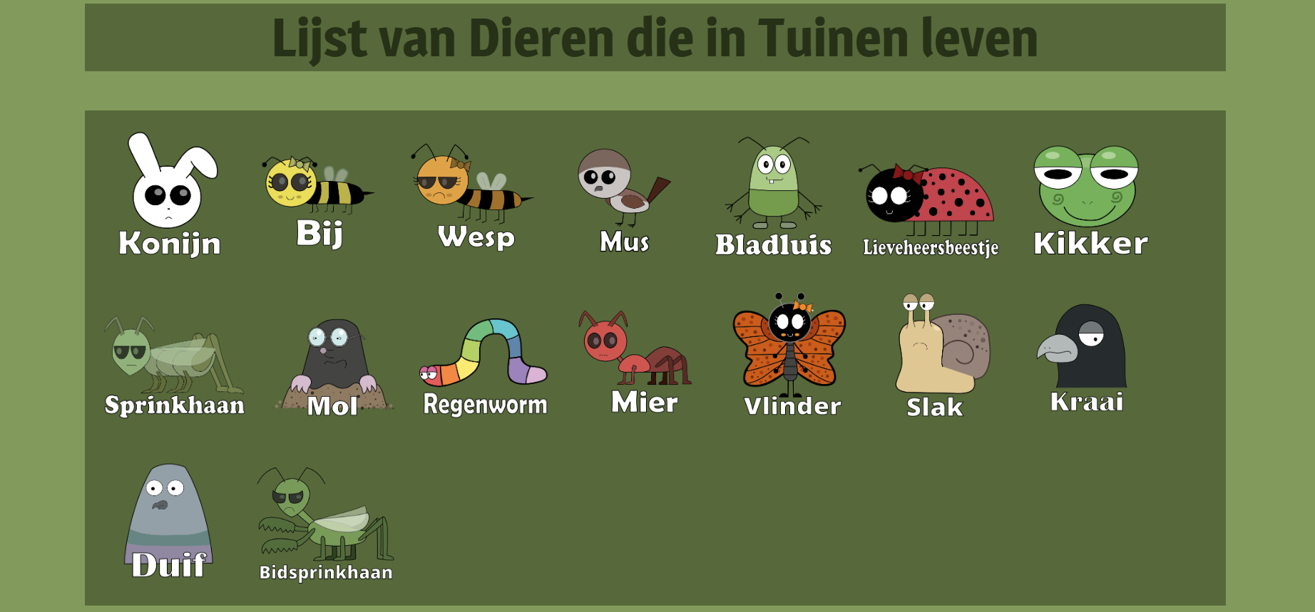 Als je naar boven en beneden gaat scrollen kom je dieren tegen, en de dieren zijn zoogdieren, vogels, reptielen, vissen, amfibieën, en insecten.