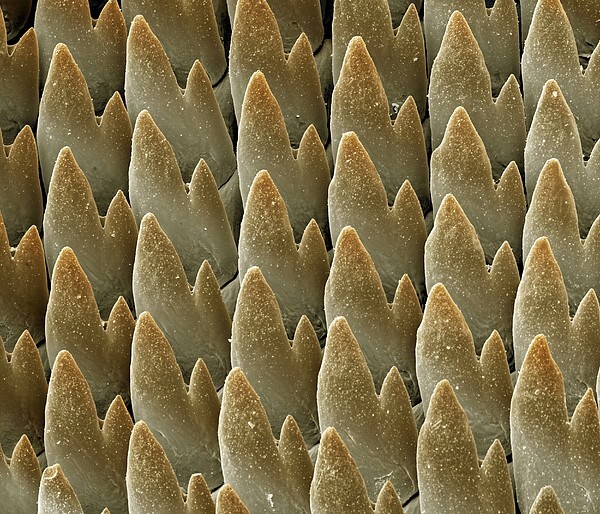De radula is een soort rasptong. Je kunt het vergelijken met een mini-schuurpapier of een tandenkam. Het is een flexibele tong met rijen piepkleine tandjes erop.